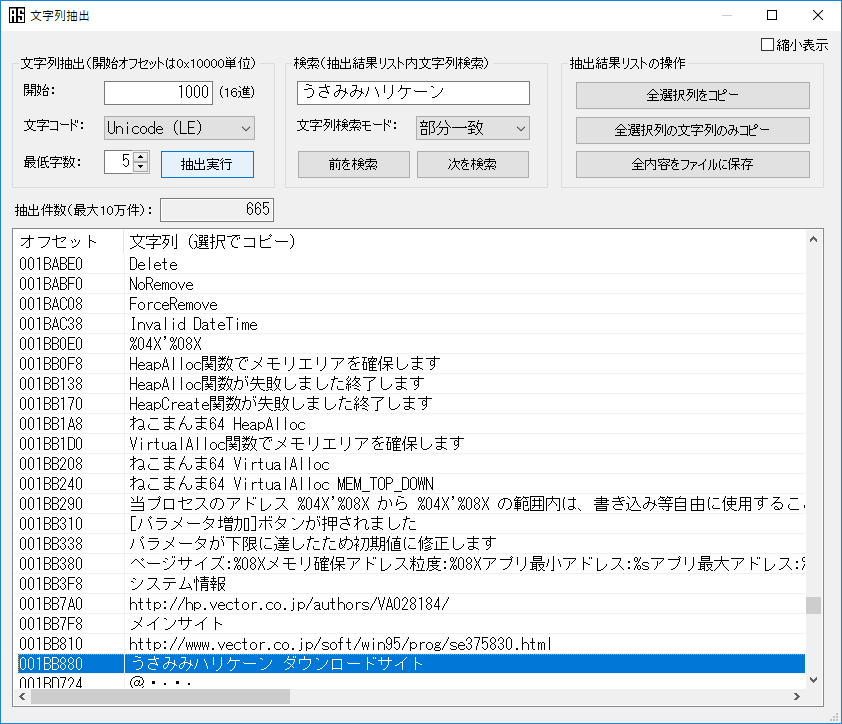 ●画面説明![]() ●ダイアログ本体 ■(サイズ変更用サイズグリップ) ダイアログの右下最下部にあるサイズグリップをドラッグすることで、このダイアログのサイズを変更可能です。文字列抽出結果を表示するリストビューも、ダイアログのサイズ変更に連動してサイズが変動します。 ●文字列抽出 ■開始(エディットボックス) 文字列抽出を行う開始オフセットを指定します。このオフセットは0x10000単位で指定してください。 ■文字コード(コンボボックス) 文字列抽出対象となる文字列の文字コードを指定します。1バイトの半角英数字や半角記号からなる文字列が対象ならば、「ASCII」を選択してください。「ASCII(NULLなし)」は、文字列終端にNULL終端すなわち文字列終端を意味するバイナリデータ0x00が無くても抽出します。「ASCII(NULLあり)」では、文字列終端にNULL終端がある場合のみ抽出します。Unicodeでは、漢字やひらがなといった日本語文字列を抽出対象とすると多大な時間がかかるケースもあるため、文字列先頭が半角英数字と半角記号の場合にのみ抽出する「Unicode (英数)」モードを用意しました。もし「Unicode (LE)」で抽出に時間がかかりすぎる場合は、この「Unicode (英数)」を試してみてください。また、例えばバイナリデータ「005100510051005100...」を、「Unicode (LE)」ならば文字列「儀儀儀儀」(0051の連続)として抽出し、「Unicode (英数)」ならば文字列「QQQQ」(5100の連続)として抽出しますので、意図しない抽出が起きていないかの確認にも使用可能です。 ■最低字数(エディットボックス) 文字列抽出対象となる文字列の最低字数(1~99)を指定します。文字列抽出時に、文字列がこの字数未満ならば抽出をスキップします。このソフトウェアが使用するAPI関数の仕様により、この最低字数はWindows ANSIとUTF-8の場合には、文字列の字数ではなくバイト数の意味となります。 ■抽出実行 文字列抽出を実行します。抽出結果は下部リストビューにリストアップされます。誤抽出が膨大なケースに対処するため、抽出数には10万件の上限を設定しています。抽出された文字列が256文字以上の場合は誤抽出の可能性があるため、文字列を256文字で切って表示します。 ●検索 ■検索対象文字列(エディットボックス) 下部リストビューにリストアップされた抽出結果の中から検索する、検索対象文字列を指定します。最大指定字数は64文字です。 ■検索モード(コンボボックス) 指定文字列検索時に、抽出された文字列との文字列比較を「完全一致」あるいは「部分一致」のどちらで行うかを選択します。抽出された文字列に余計な文字が付くケースが多いことから、検索モードはまず部分一致で試されることをお勧めします。 ■前を検索・次を検索 指定された検索条件で前方あるいは後方への検索を実行します。下部リストビューで現在選択されている(複数選択時にはフォーカスがある)項目のオフセットが検索開始の基点となります。 ●抽出結果 ■抽出件数(エディットボックス) 下部リストビューにリストアップされた抽出結果の件数を表示します。この件数が上限の10万件ならば、開始オフセットを10万件分よりも後方に変更して再抽出してみてください。 ■全選択列をコピー 下部リストビューにリストアップされた抽出結果のうち、選択列のオフセットと抽出文字列をまとめて、クリップボードにコピーします。 ■全選択列の文字列のみコピー 下部リストビューにリストアップされた抽出結果のうち、選択列の抽出文字列だけをまとめて、クリップボードにコピーします。 ■全内容をファイルに保存 下部リストビューにリストアップされた抽出結果全部をまとめて、Unicode文字列のテキストファイルに出力します。必要に応じて、テキストエディタでの整形や可読文字への変換などを行ってください。 ■抽出結果リスト(リストビュー) 下部リストビューにリストアップされた抽出結果の中で項目を選択すると、その項目の抽出文字列をクリップボードにコピーします。同時に、このソフトウェアのバイナリエディタが起動されているならば、選択された項目のオフセットを元に、バイナリエディタでの表示オフセットを変更します。 |